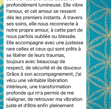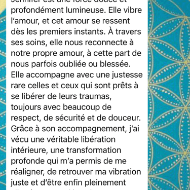 Jennifer est une force douce et profondément lumineuse. Elle vibre l’amour, et cet amour se ressent dès les premiers instants. À travers ses soins, elle nous reconnecte à notre propre amour, à cette part de nous parfois oubliée ou blessée. Elle accompagne avec une justesse rare celles et ceux qui sont prêts à se libérer de leurs traumas, toujours avec beaucoup de respect, de sécurité et de douceur. Grâce à son accompagnement, j’ai vécu une véritable libération intérieure, une transformation profonde qui m’a permis de me réaligner, de retrouver ma vibration juste et d’être enfin pleinement alignée avec qui je suis. Ses soins sont puissants, profonds et subtils. Jennifer a ce don précieux de faire parler les âmes, d’accéder à l’invisible avec amour, vérité et humilité. Une rencontre qui transforme et laisse une empreinte durable.