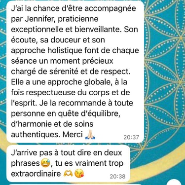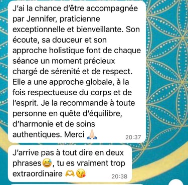 J'ai la chance d'être accompagnée par Jennifer, praticienne exceptionnelle et bienveillante. Son écoute, sa douceur et son approche holistique font de chaque séance un moment précieux chargé de sérénité et de respect. Elle a une approche globale, à la fois respectueuse du corps et de l'esprit. Je la recommande à toute personne en quête d'équilibre, d'harmonie et de soins authentiques.